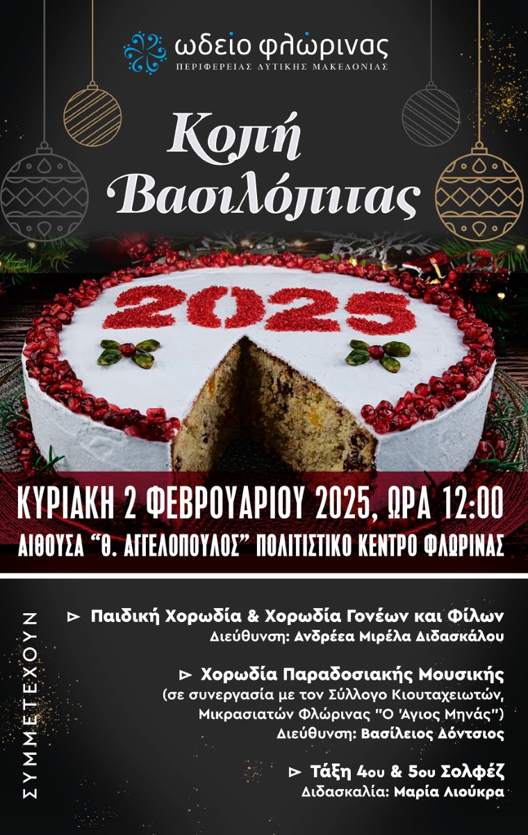 Την Κυριακή 12 Φεβρουαρίου 2024 και ώρα 12 μ. στην αίθουσα “Θ.Αγγελόπουλος” του Πολιτιστικού Κέντρου Φλώρινας το Ωδείο Φλώρινας θα πραγματοποιήσει την κοπή Βασιλόπιτας με τέσσερα φλουριά για μαθητές, γονείς, χορωδούς και προσωπικό του Ωδείου και την καθιερωμένη συναυλία μικρής διάρκειας με τη συμμετοχή των χορωδιακών συνόλων του Ωδείου.