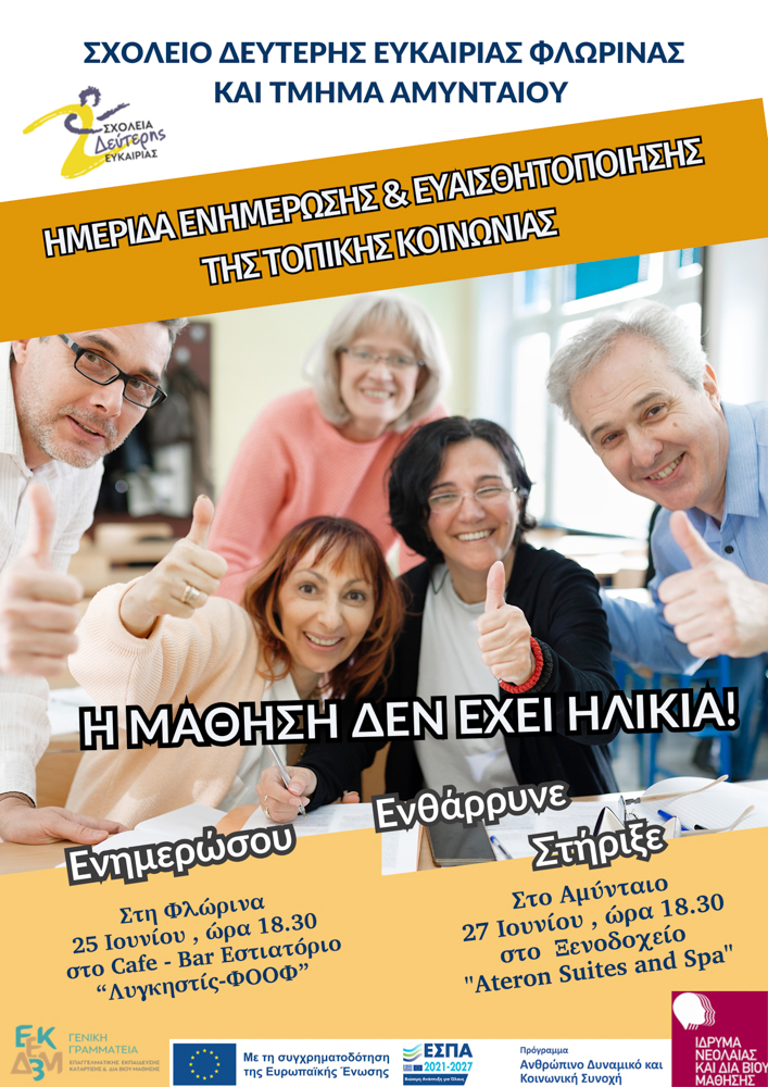 2025 και ώρα 18:30, στη Φλώρινα, στο Café Bar-Εστιατόριο « Λυγκηστίς-Φ.Ο.Ο.Φ.» και στις 27 Ιουνίου 2025 και ώρα 18:30, στο Αμύνταιο, σε αίθουσα του ξενοδοχείου «Ateron Suites and Spa», με στόχο την ενημέρωση και ευαισθητοποίηση της τοπικής κοινωνίας για το έργο και την αξία των Σχολείων Δεύτερης Ευκαιρίας (ΣΔΕ).