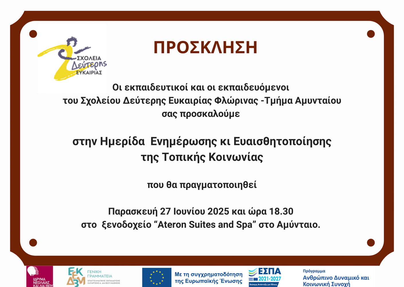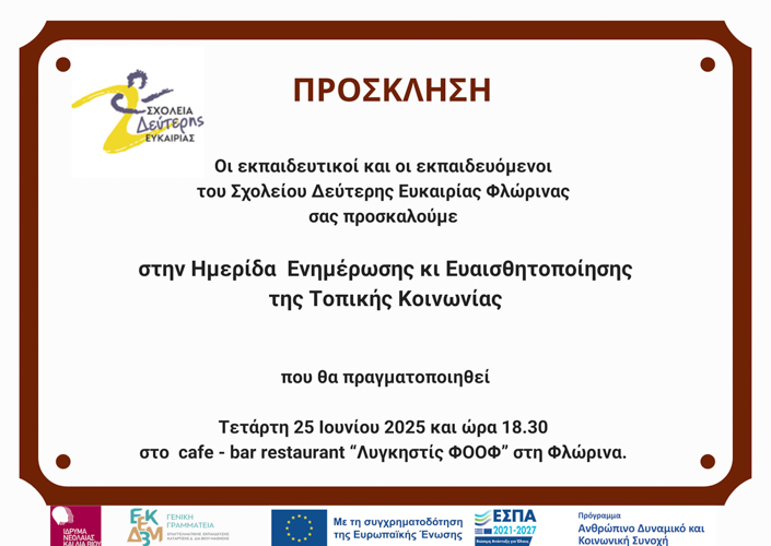 Το Σχολείο Δεύτερης Ευκαιρίας Φλώρινας σας προσκαλεί σε μια ανοιχτή εκδήλωση – ενημερωτική ημερίδα που θα πραγματοποιηθεί στις 25 Ιουνίου